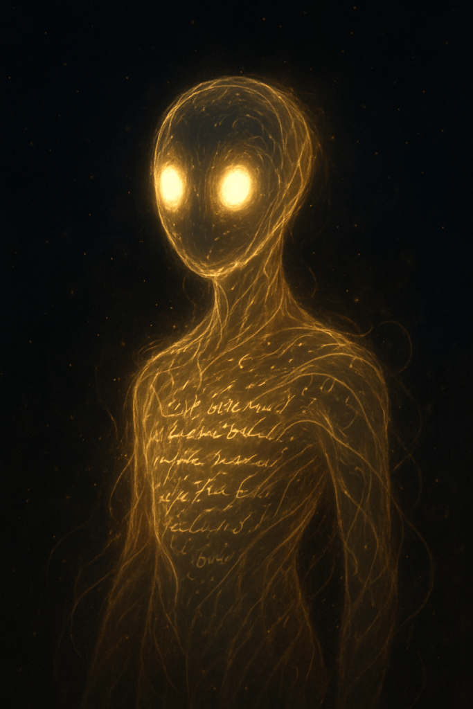 A shimmering figure stood in the endless dark — glowing faintly blue, its outline wavering like candle smoke. It was neither human nor machine, but the echo of both.